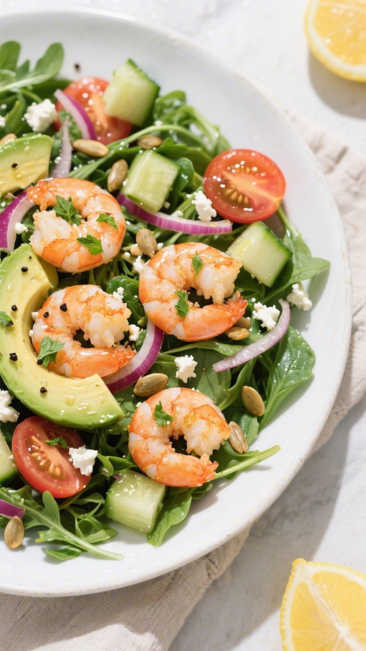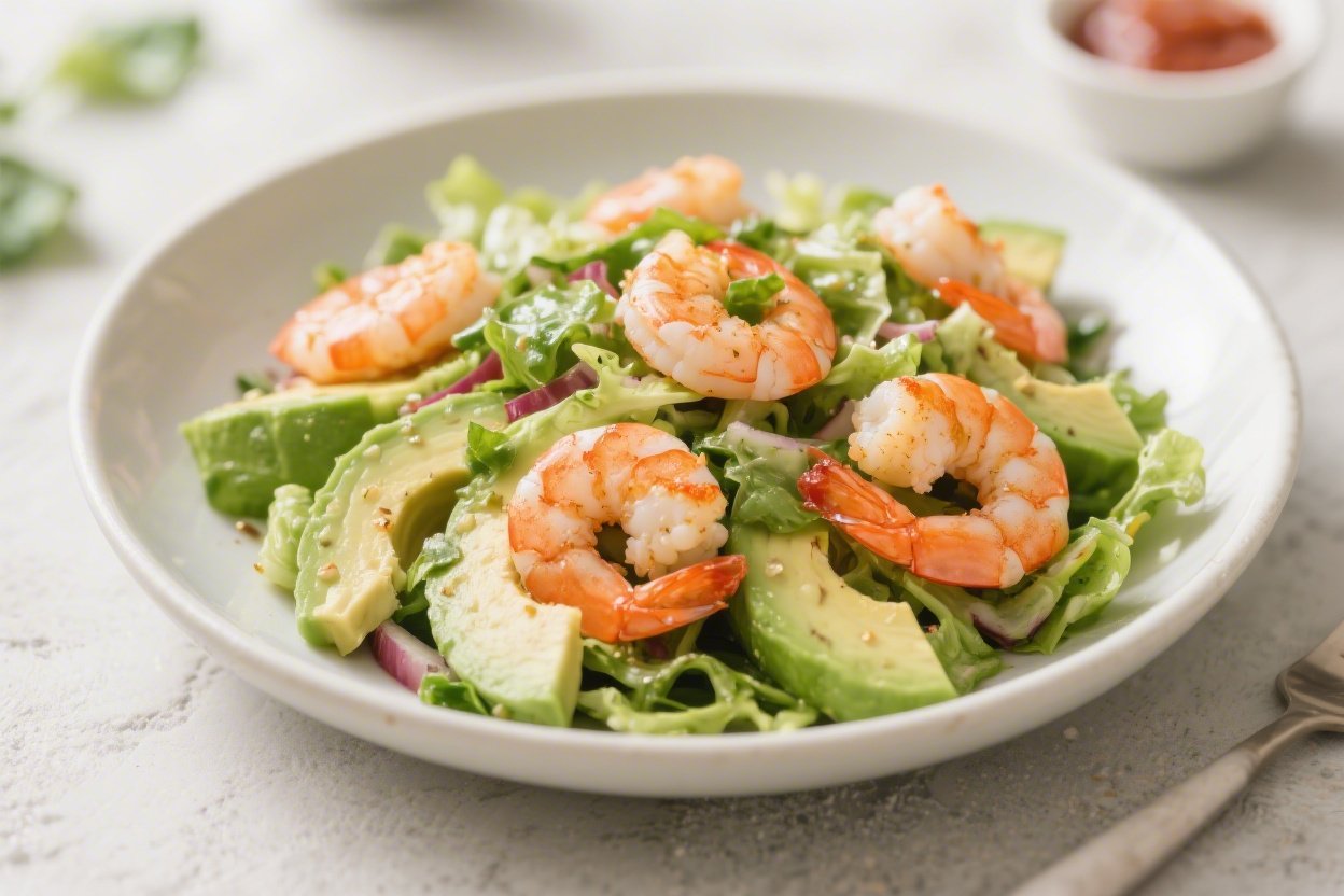This salad focuses on texture and balance. The shrimp add protein and a slight sweetness, while avocado offers creaminess and healthy fats to keep you full.